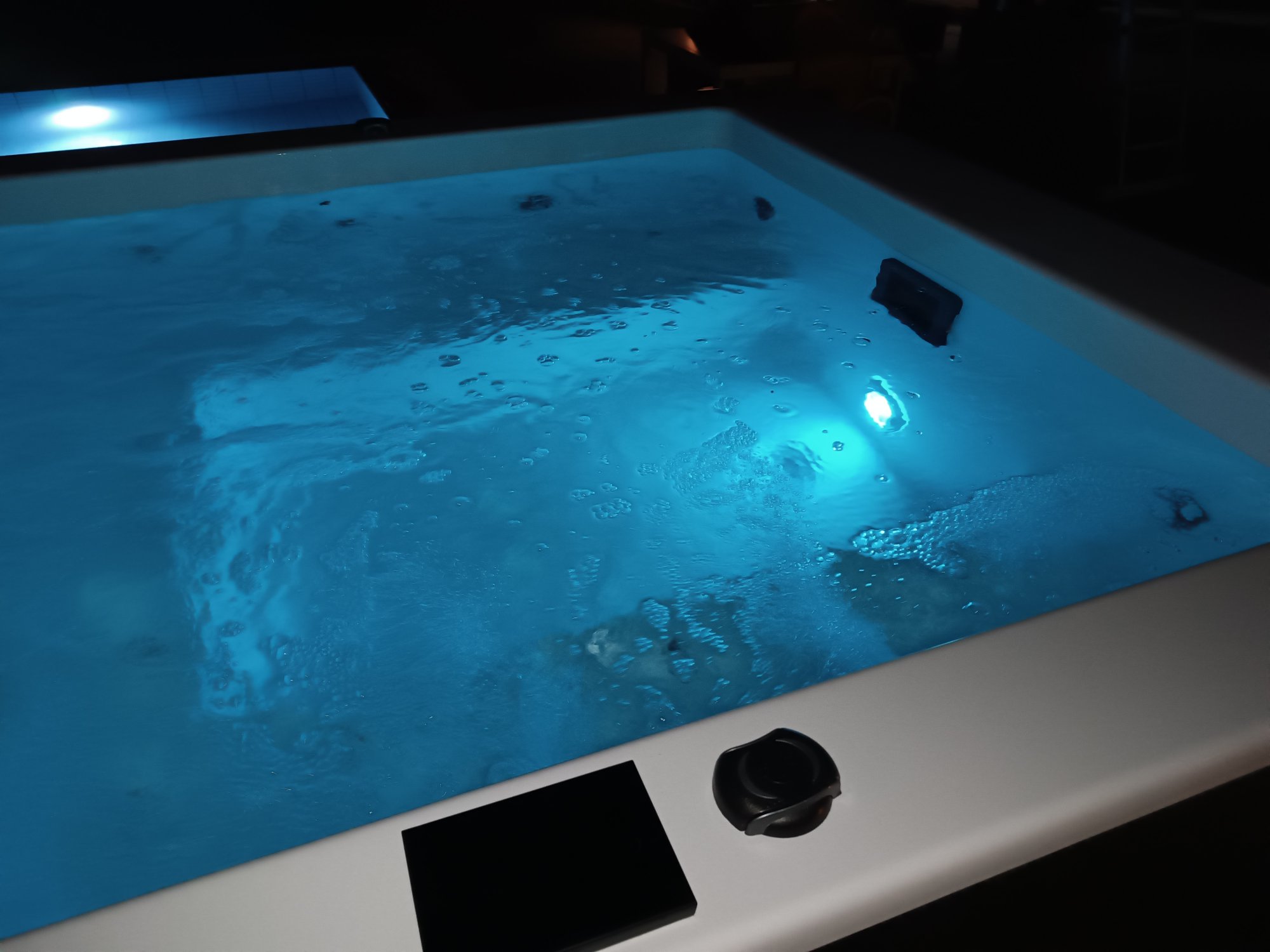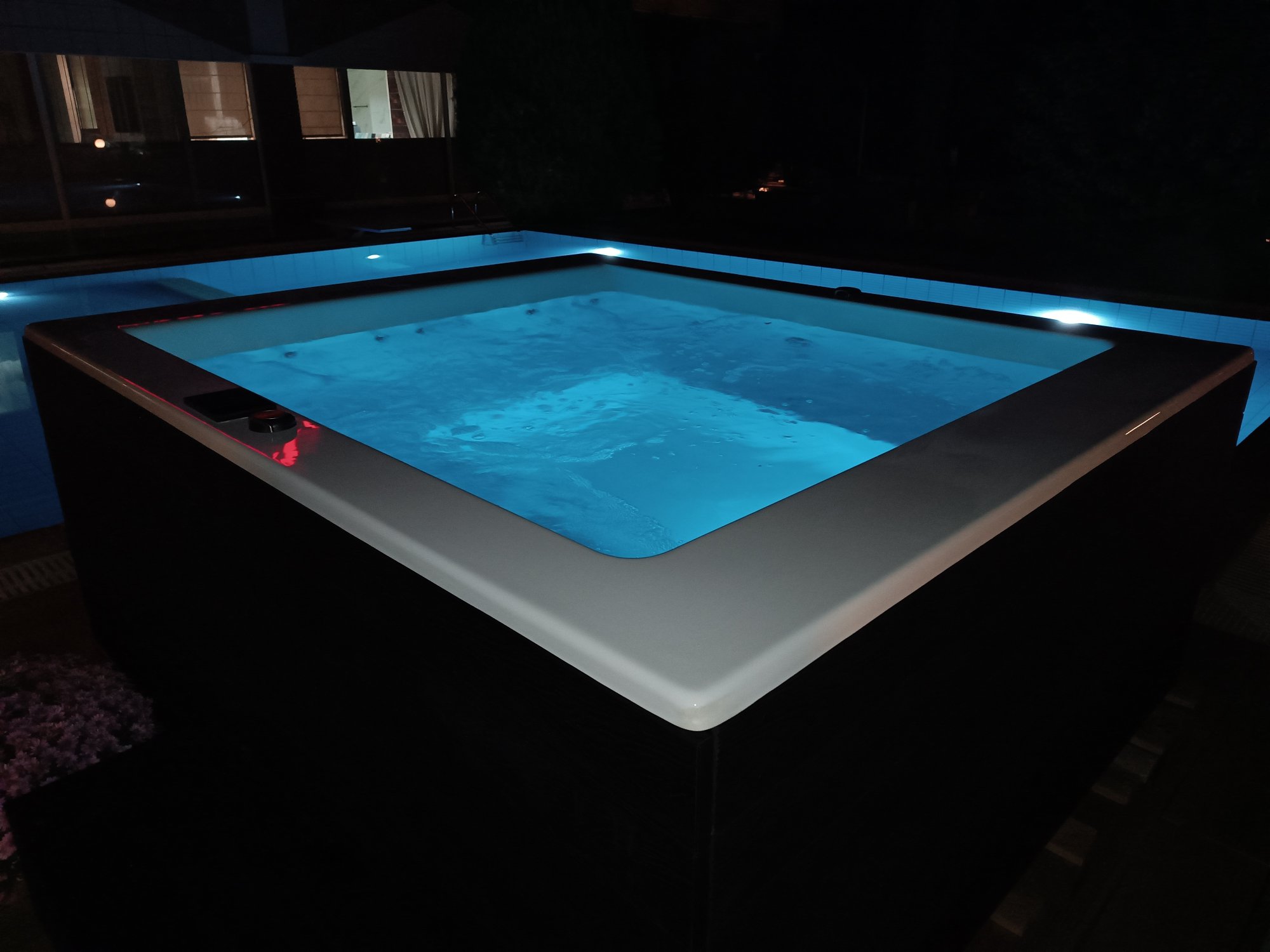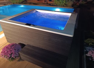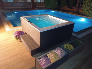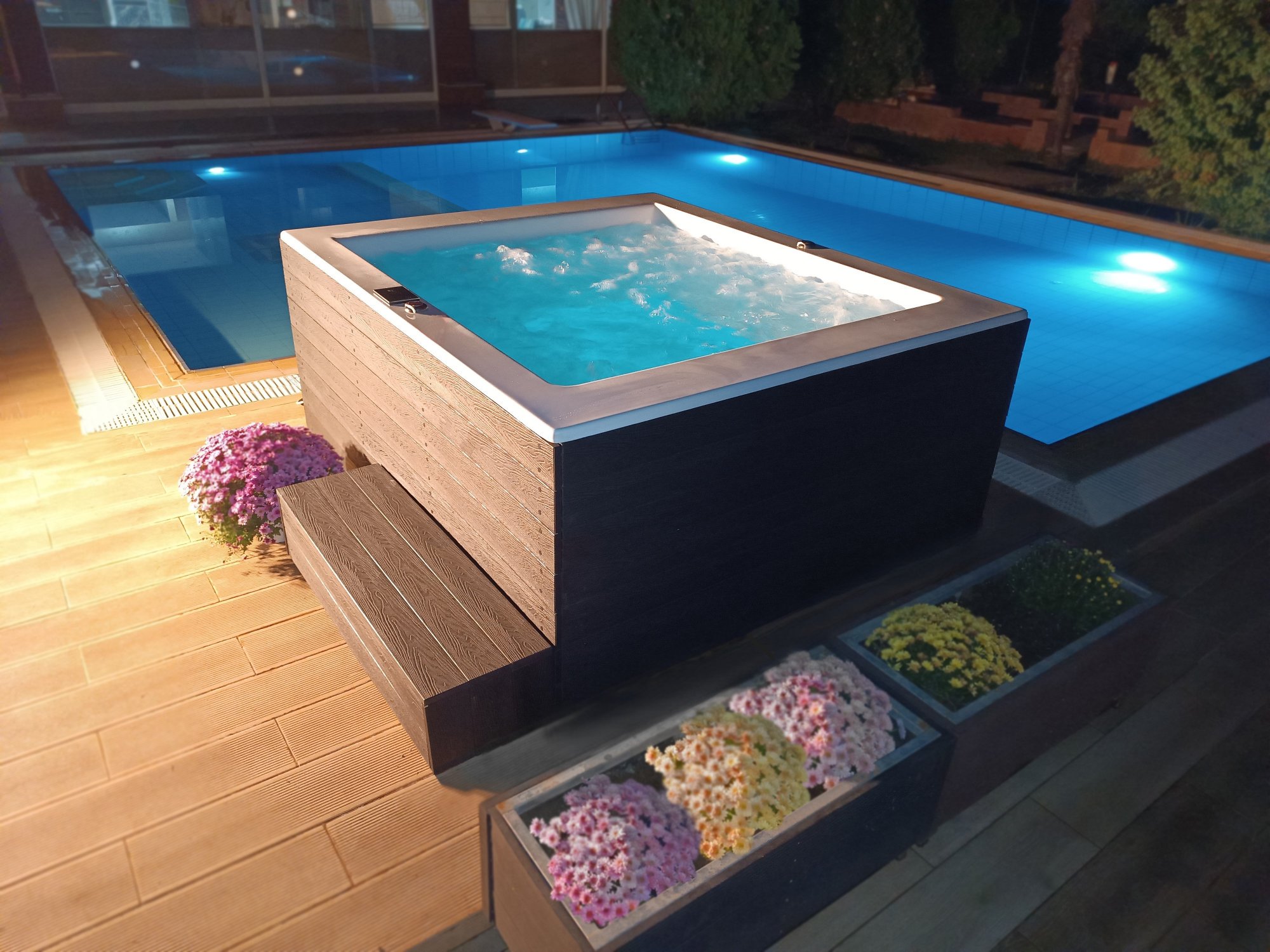 Linear acrylic big dimmension bathtub (mini pool) for 5-6 persons. Modern minimalistic design spa bathtub of high aesthetics for indoor and outdoor use, available in glossy white. Provides absolute relaxation thanks to hydro-massage, air-massage and chromo therapy. Waterfall featured outlets can be adjusted as well as various luxury extra equipment and accessories. WPC Panels are available in wood patterns and textures.